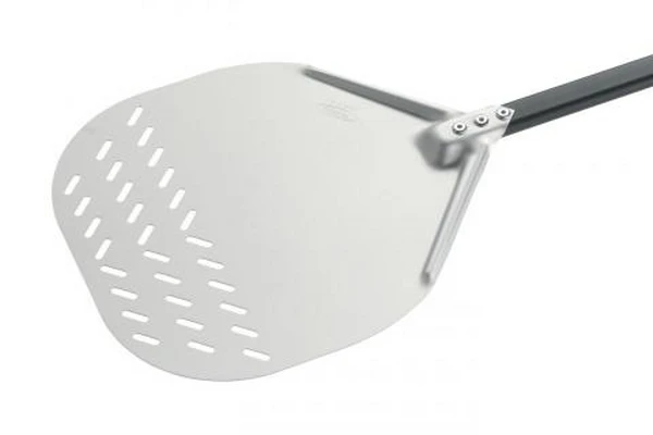 La presenza di fori appositamente studiati sulla parte iniziale della testa permette di scaricare l’eventuale farina rimasta sotto la pizza nella fase di spolvero.